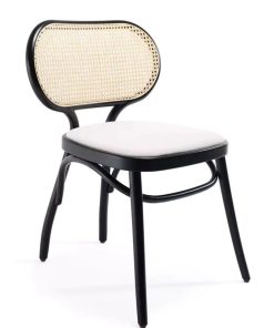 Materials: Bentwood lounge chair. Solid beechwood frame lacquered black or white. Upholstered seat with woven cane back.